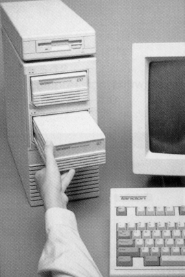 Data and information is stored on a magnetic tape. These look like small cassette tapes. The major disadvantage if tape storage is that it is sequential. Every time you want to find something on the tape, the computer has to start at the beginning of the tape to search for it.All other methods of storing data and information are random access. The computer finds out where the information is and goes directly to that location.
