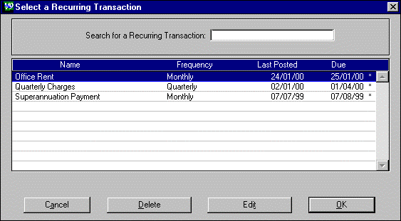Note: To avoid confusion, it is a good idea to click on the Edit button just before using the recurring transaction if you want to change it.