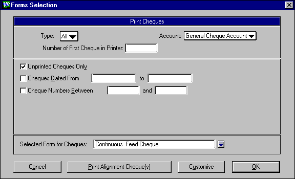 Laser Cheque is for a laser or ink jet printer. The standard layout has the cheque at the top of the page, followed by two stubs giving details about the cheque. User Customised Cheque is for when you design your ownClick on Print Alignment Cheque to print a sample cheque. Adjust your printer alignment if necessary and reset the top of the form.