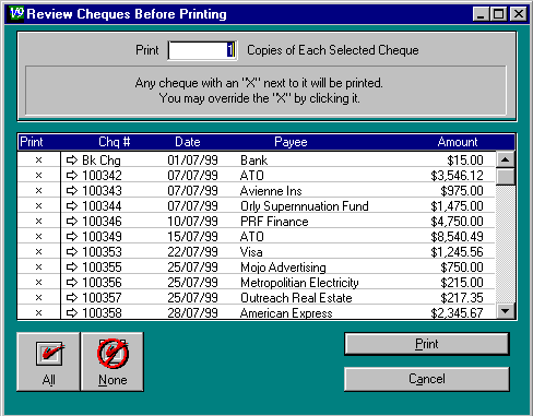 Click on the None button to de-select all cheques.Click on Cancel to cancel the print run.