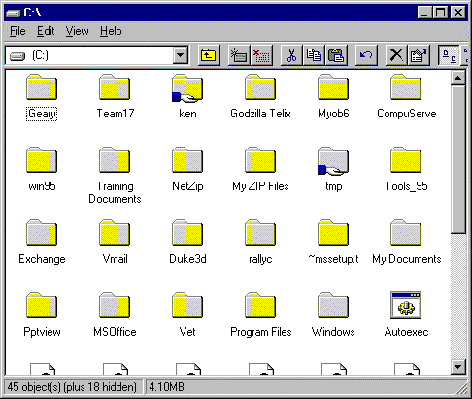 This C window shows you all the files and folders you have on your hard disk. Each folder will contain more folders and/or files. The folder that contains the files used by Microsoft® Windows® 95 is called Windows.