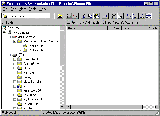 - In the Folders pane, click on the folder name Picture Files I to open that folder in the Files pane. The Files pane should be blank, as below.