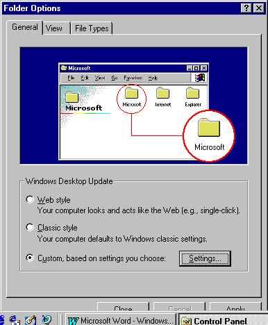 - Click on the Folder Options button to display the Folder Options dialogue box. This will save and close the Display Properties dialogue box. You can then make any changes you wish in the Folder Options dialogue box as discussed in Windows 98 Module 1.