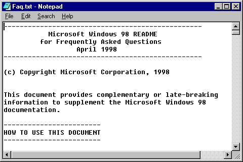- Double click on the shortcut. You will be looking at a file titled Microsoft Windows 98 Readme for Frequently Asked Questions. The file will be opened in Notepad.