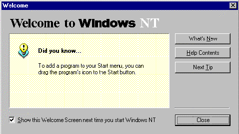 At the bottom of the Welcome window is the option Show this Welcome Screen next time you start Windows NT. If there is a tick next to this option you will see this window every time you start your computer.