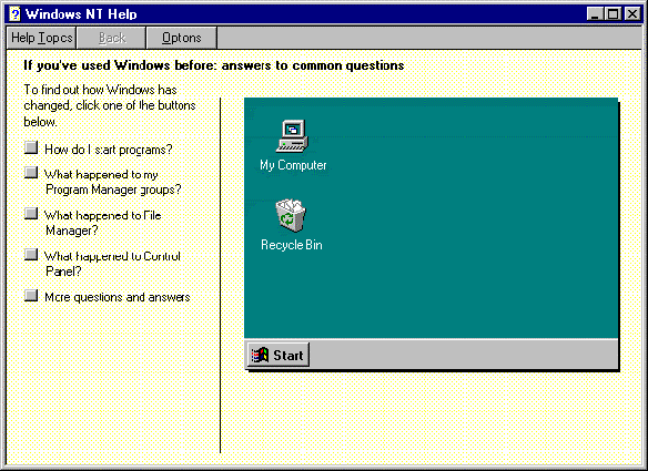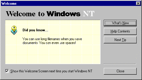 This window tells you about some of the things that are new on this interface. It is designed for those people who have used Windows or a Windows type interface before and are now updating their knowledge to Windows NT.
