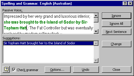 - Click on Ignore to ignore this error. If we changed it the words The Fat Controller in the sentence would no longer make sense.