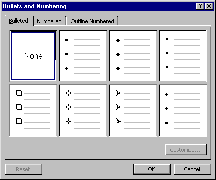 - Select Format/Bullets and Numbering. The following dialog box will appear.