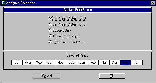 Click and drag to select a range of months (they will be highlighted). The profit and loss analysis will show the activity over these months.Click on OK . The analysis you specified will be displayed in the Analyse Profit and Loss window.