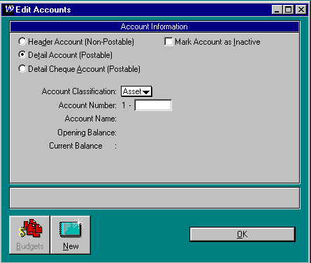 Select (by clicking in the radio button) what sort of account this is: a Header Account , Detail Account or Detail Cheque Account .