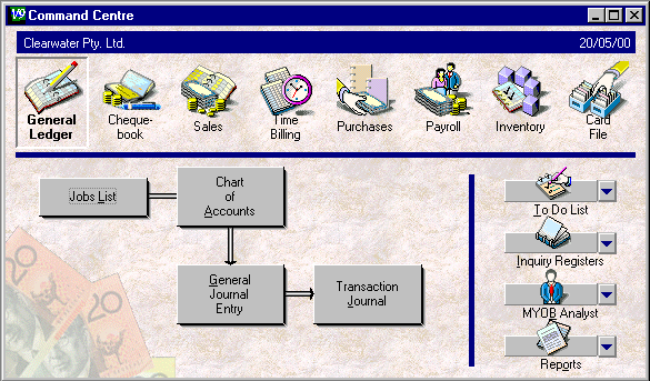 This is where all entries that do not belong in any of the other command centres are made. It also contains the business's Chart of Accounts, which can be modified as the business changes, and a Jobs List to track Profit and Loss centres.