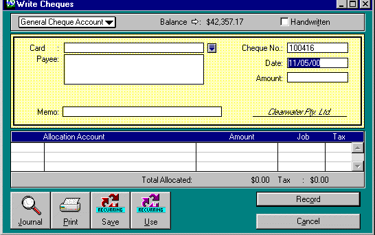 The total of the amounts allocated must equal the cheque amount before you can record the transaction.If you make a major mistake while you are writing out the cheque, choose Erase Cheque Transaction from the Edit menu to erase all the fields.