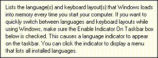- Click on the Language tab. This is where you specify what language(s) are loaded into the computer when Windows 95 starts up.