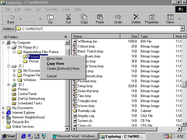 - Right click (click with the right mouse button) on the file to be moved or copied and hold the mouse button down. We will use Circles.bmp.