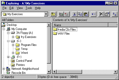 Notice that a plus sign has appeared next to the floppy disk drive icon in the Folders pane. Click on this plus sign to display the folder My Exercises in the Folders pane.