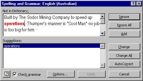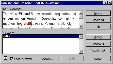 NOTE: It is common for proper names to be treated as spelling mistakes by Word97 - names like Augusta, Thomas etc. If this is a name you use a lot you may want to Add it to your dictionary (click the Add button when the name comes up as a spelling mistake), or else just Ignore it.