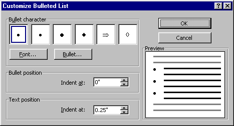 - Click on a different bullet and then on OK. The bullet will have changed to the one you selected.
