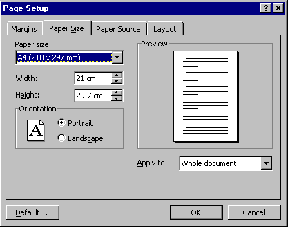 - At the top of the dialog box is the Paper Size option. Click on the down arrow next to this option to see the list of paper sizes available. Scroll through the list and notice the Custom option. Then return the size to A4.